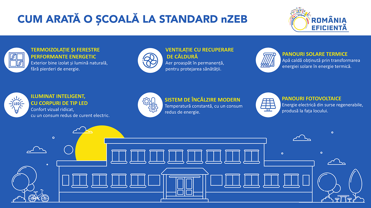 Standardul nZEB (clădire cu un consum de energie aproape zero) este cel care stă la baza proiectelor de reabilitare energetică a clădirilor școlare din sistemul public de învățământ. O școală la standard nZEB este, în esență, o școală care dispune de elementele de construcție și funcționalitate care permit utilizarea energiei într-un mod responsabil,care își produce o parte din energia termică și electrică din surse proprii, regenerabile și asigură un nivel superior de confort cu un consum minim. Este o școală care arată copiilor, în fiecare zi, cum arată sustenabilitatea pusă în practică.
